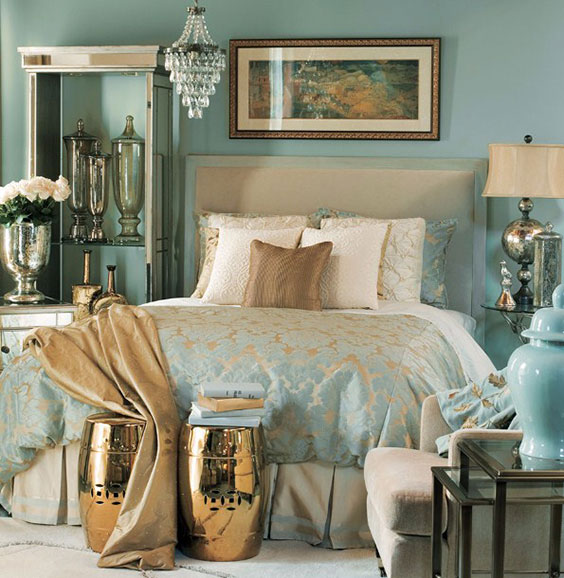 Бирюзовый. Один из самый интригующих цветов. С его помощью можно сделать из своей спальни роскошной место, наполненное грациозностью и уникальностью. Наиболее подходящие сочетания с такими цветами: коричневый, серый, бежевый, персиковый, цвет золота, голубой и зелёный.