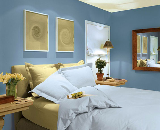 Синий. Сочетая насыщенный синий с более мягкими и нейтральными тонами, можно добиться очень неожиданного и оригинального эффекта. Синий меркнет если использовать его для окрашивания стен в большой комнате. Глубокие оттенки синего очень легко сочетаются с тонами из тёплой палитры и для спальни такое сочетание может стать самым подходящим.