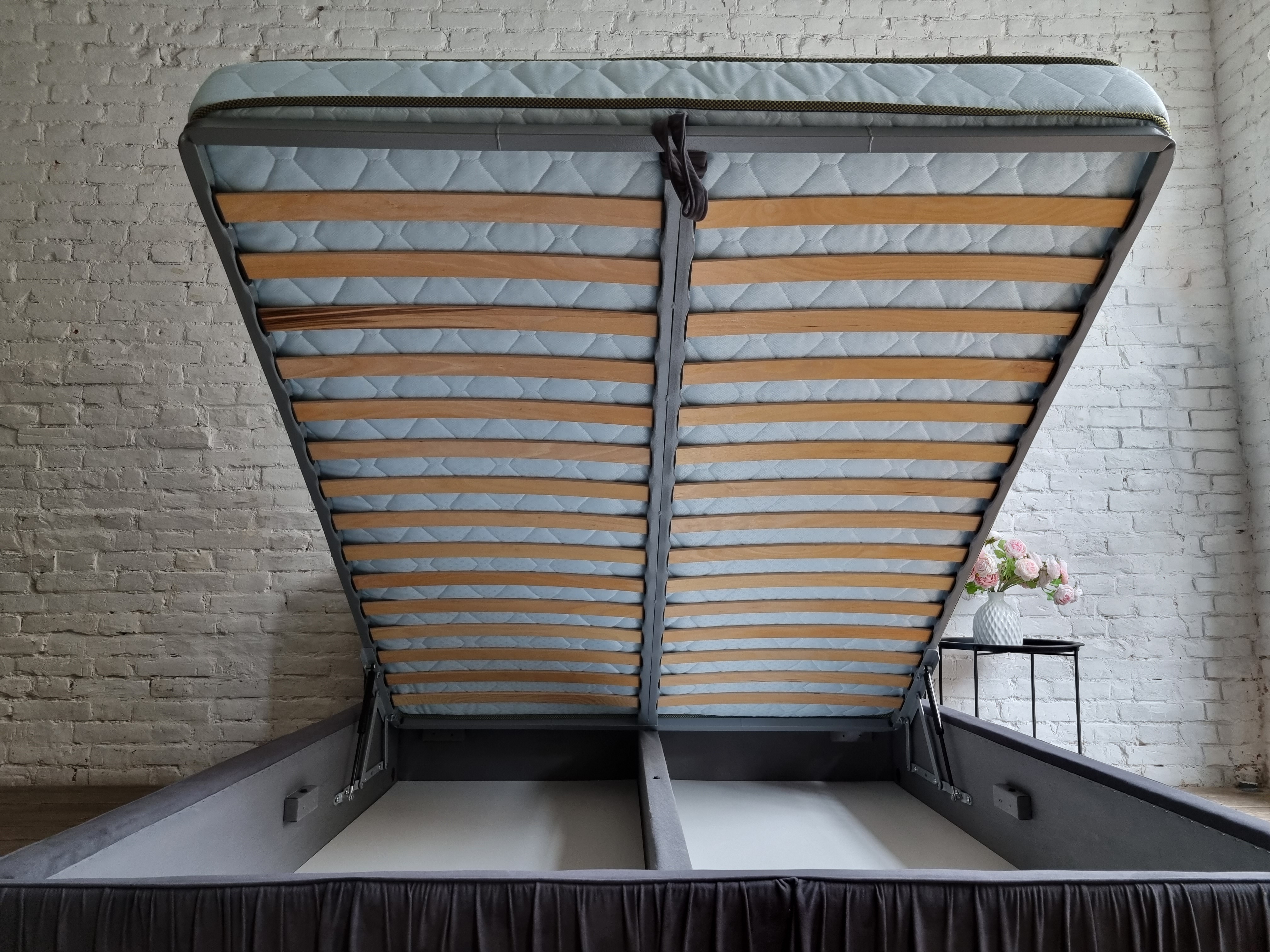 при выборе комплектации с подъемным механизмом в кровати будет идти цельносварной металлический каркас со встроенными внутрь широкими ламелями, благодаря эту полностью отсутствует проблема их выпадения.