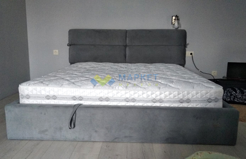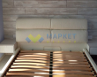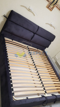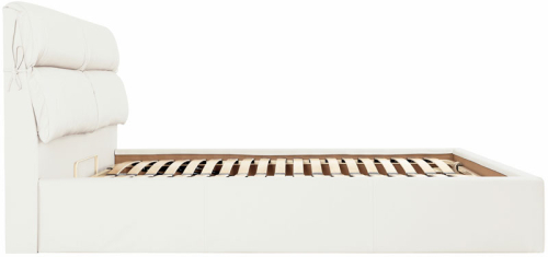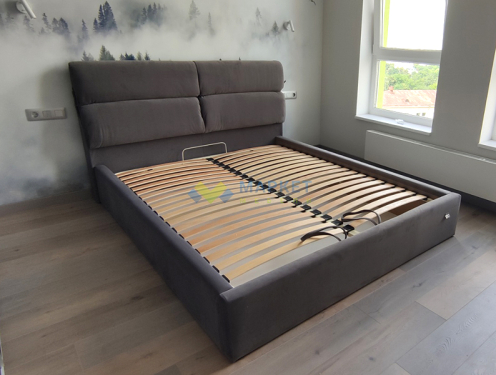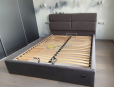 деревянная рамка с ламелями (38 шт) и встроенным матрасом + обитые широкие царги (7,5 см) и широкое изголовье + подъемный механизм с двумя импортными пневмопатронами + бельевой ящик глубиной 18,5 см со спанбондом на дне + пластиковые опоры 5 мм |