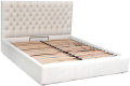 широкое изголовье + широкие царги (6 см) со съемным цельным чехлом на липучках + металлическая цельносварная рамка с ламелями (38 шт) + дополнительная нижняя металлическая цельносварная рамка + подъемный механизм с двумя импортными пневмопатронами + бельевой ящик глубиной 17 см с ламинированным ХДФ на дне + металлические хромированные опоры 4 см |