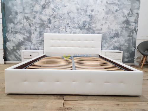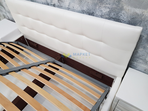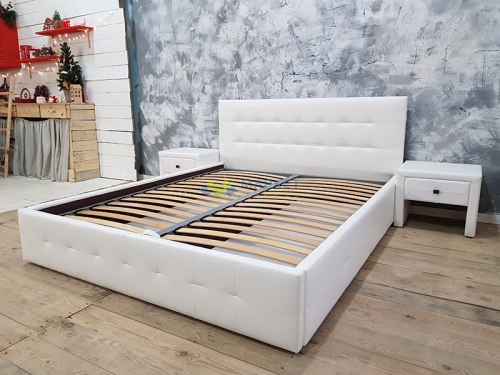 в комплектации с подъемным механизмом в основе кровати цельносварной металлический каркас и гнутые буковые ламели.