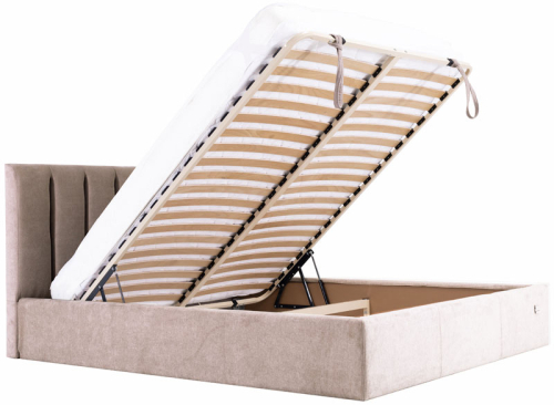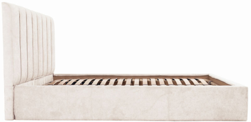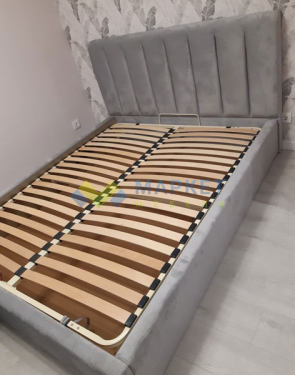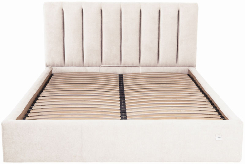 деревянная рамка с ламелями (38 шт) и встроенным матрасом + обитые широкие царги (7,5 см) и широкое изголовье + подъемный механизм с двумя импортными пневмопатронами + бельевой ящик глубиной 18,5 см со спанбондом на дне + пластиковые опоры 5 мм |