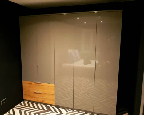 Фасад: трехслойное высокоглянцевое покрытие, высушенное под ультрафиолетовыми лучами. Ламинированная ДСП 18 мм.