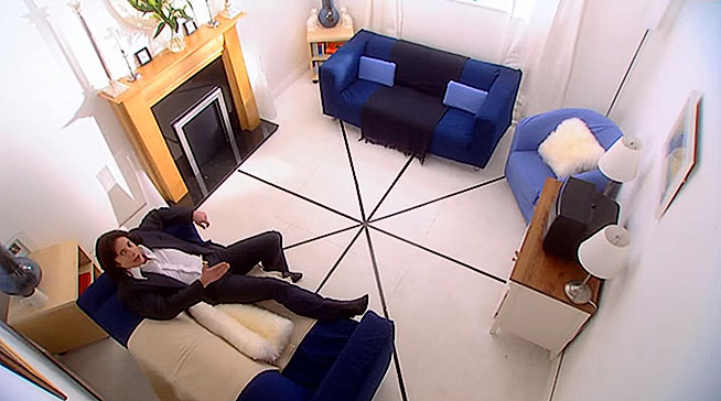 Коли приходять гості, кожен захоче сам вибрати, куди йому дивитися: на іскри вогню в каміні чи в телевізор. Щоб втілити цю ідею, достатньо змінити розташування диванів і крісел навколо цих предметів. Якщо поставити 2 однакові дивани один навпроти одного, між ними проходитиме невидима межа, кінці якої з'єднують телевізор і камін - 2 точки тяжіння уваги, таким чином, кілька людей можуть бачити обличчя один одного, а водночас хтось може насолоджуватися краєвидом на камін, а хтось дивитися улюблений фільм.