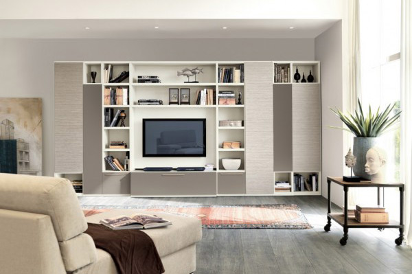 Модульна система приваблива ще тим, що в ній об'єднуються різнопланові секції, а картина загалом, при цьому, залишається лаконічною. Якщо розглядати шафу, то вона може бути відкритою, закритою або комбінованою. В одній модульній системі може бути 1 напіввідкрита шафа, один закритий пенал і 1 шафа повністю відкрита і схожа швидше на велику полицю. Така багато варіантність позбавляє від пошуку компромісів. Якщо потрібна і відкрита, і закрита шафа, а місця для всіх не вистачає, то в модульній системі все складено так, щоб усе необхідне було укомплектовано максимально ефективно для економії простору. Деякі елементи можуть кріпитися до стіни і не бути прив'язаними до підлоги, що дає змогу підвісити цілу тумбу в місці, яке пустує біля телевізора.