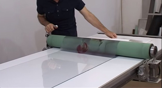 Плівковий фотодрук. Основна відмінність цього методу від попереднього полягає в тому, що зображення спочатку наноситься не на скло, а на плівку, яка надалі наклеюється на очищену поверхню скла. Плівка клеїться за допомогою полімерного клею тією стороною, на якій знаходиться зображення. Після нанесення зображення скло піддається УФ-опроміненню, щоб затвердів клей і малюнок остаточно зафіксувався. УФ опромінення може бути замінено використанням температури близько 180 градусів. Існують різні обладнання для такої технології. Наприклад, технологія Люмінар передбачає обробку поверхні за допомогою ламінатора, який, проходячи по поверхні скла, виганяє все повітря між плівкою і поверхнею скла. Кожен виробник вибирає для себе найбільш прийнятний варіант нанесення фотодруку плівковим способом.