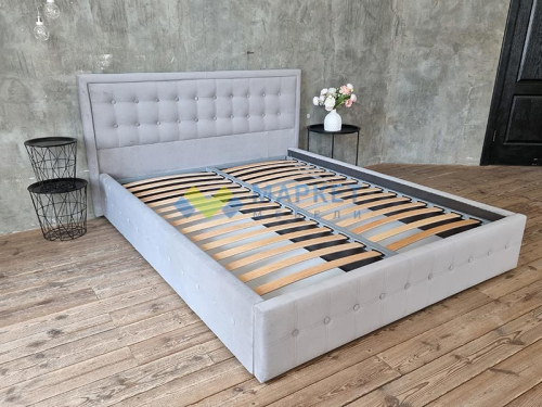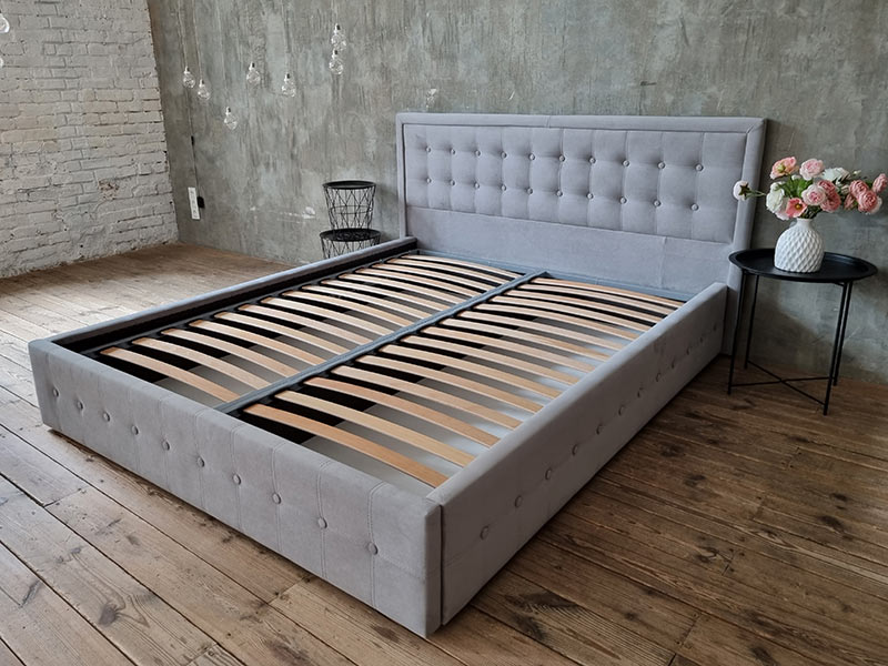 при виборі комплектації з підйомним механізмом у ліжку йтиме цільнозварний металевий каркас із вбудованими всередину широкими ламелями, завдяки цьому повністю відсутня проблема їх випадання.