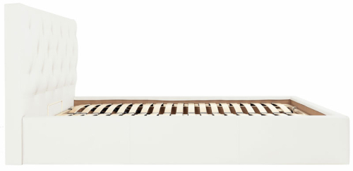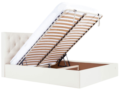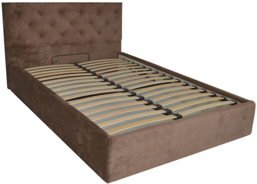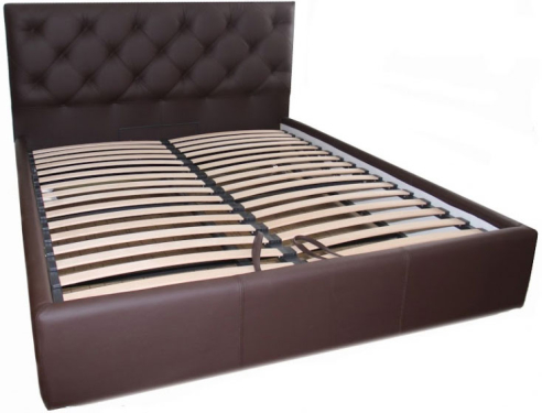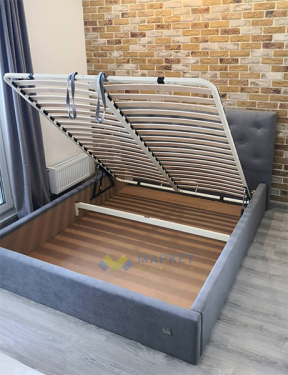металева розбірна рамка з ламелями (38 шт) + оббиті широкі царги (7,5 см) і широке узголів'я + підйомний механізм із двома імпортними пневмопатронами + білизняна шухляда глибиною 18,5 см зі спанбондом на дні + пластикові опори 5 мм |