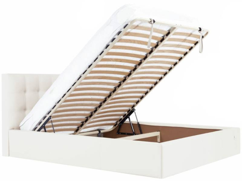 Металевий каркас і ортопедичні букові ламелі; В основі узголів'я масив дерева; Газовий амортизатор потужністю до 2200 Н; Може бути оснащена додатковою нижньою рамою; Прикрашається ґудзиками і меблевими стразами
