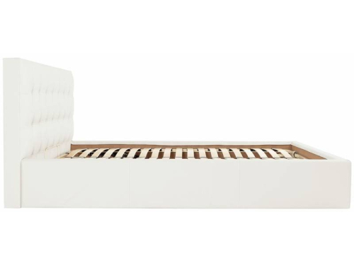 Вишуканий стиль забезпечено завдяки оббивці поверхні: якісний шкірозамінник із приємною на дотик текстурою поверхні. Узголів'я - м'яка, простьобана ґудзиками поверхня, на якій зроблено головний акцент. Всі інші частини корпусу - зокрема, царги (боковини нижче спального місця) обтягнуті шкірозамінником без ґудзиків. Завдяки такому поєднанню підходів ліжко виглядає одночасно і строго, і розкішно.