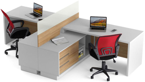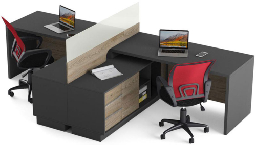 • Комплектація: тумба 150х50х62,9 см 2 шт., напрямні - метабокси, ручки - профільний погонаж, у тумбі: 2 полиці, одні дверцята, 3 висувні шухляди і ніша для системного блоку, перегородка столу - ДСП+скло